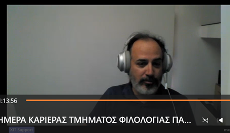 Ο Πάνος Λιάκος, απόφοιτος τμήματος Φιλολογίας, παρουσίασε τη δική του διαδρομή μετά τις προπτυχιακές σπουδές: μεταπτυχιακό δίπλωμα ΜΑ (Cinema Studies, NYU-TISCH), Θεωρητικός του Κινηματογράφου, Σύμβουλος social media, Μεταφραστής θεατρικών έργων, Συνεργάτης εταιρείας συγγραφής Δελτίων Τύπου. Επίσης, σημείωσε από την εμπειρία του στο εξωτερικό, το υπόβαθρο που χαρίζουν οι φιλολογικές σπουδές και η κειμενοκεντρική προσέγγιση αναγνωρίζονται ως σημαντικά σε προγράμματα μεταπτυχιακών σπουδών και στο χώρο Τέχνης και των μέσων κοινωνικής δικτύωσης. Οι ανθρωπιστικές επιστήμες είναι και κοινωνικά εγνωσμένες.